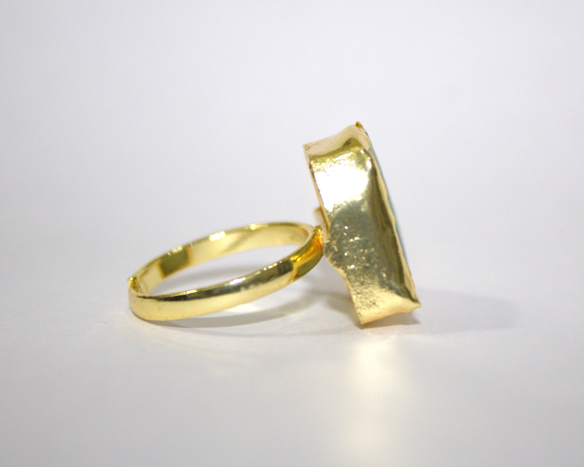This bold statement ring is handcrafted from premium brass and finished with a rich gold-plated polish. It features a striking real natural raw green stone, set to highlight its organic edges and natural texture.