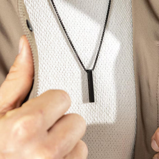 A bold expression of minimal luxury. The Obsidian Line Pendant Necklace features a sleek black bar pendant paired with a sturdy chain, designed for men who prefer clean, modern aesthetics. Its sharp linear form adds effortless edge to both casual and smart outfits. Subtle, masculine, and timeless—this piece is perfect for everyday wear or layering with street-style looks.