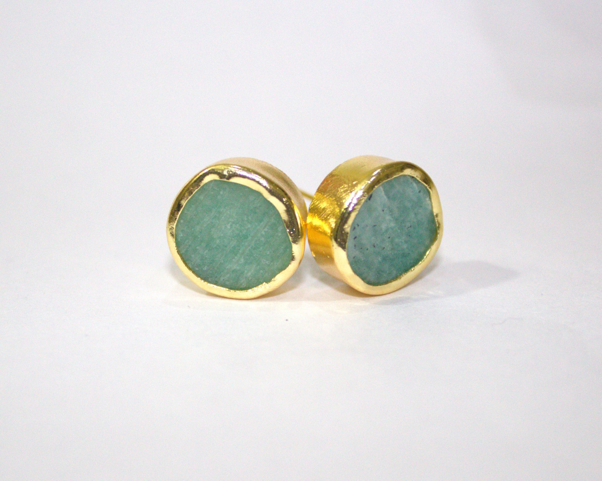These minimal stud earrings are handcrafted from premium brass and finished with a smooth gold-plated polish. Each stud features a real natural raw stone in soothing aqua tones, framed to highlight its organic texture and natural beauty.